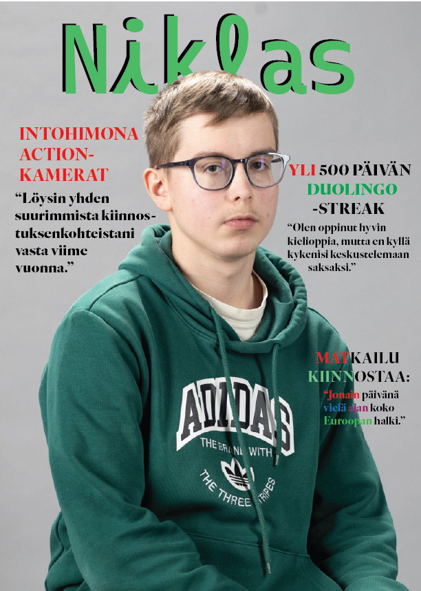 Siinä on lehden kansi, jonka tein. Tiedän mitä saatat ajatella: “Put some more smile on, eh?”, mutta ei ollut parempaakaan kuvaa saatavilla. Tai olisi kyllä ollut iloisemman näköisiä kuvia, mutta niissä oli aika huono valaistus. Joo, mitäköhän sanottavaa tästä posterista olisi? Olen itse ainakin ihan tyytyväinen tähän, ja käytin työhön myös suhteellisen paljon aikaa. Nimeni saaminen pääni taakse vei paljon aikaa, ja jos pitäisi arvioida, niin varmaan jopa 1/3 koko projektin teon ajasta. Tekstit liittyvät kiinnostuksenkohteisiini. Juu, eipä tästä varmaan oikein muuta sanottavaa ole.